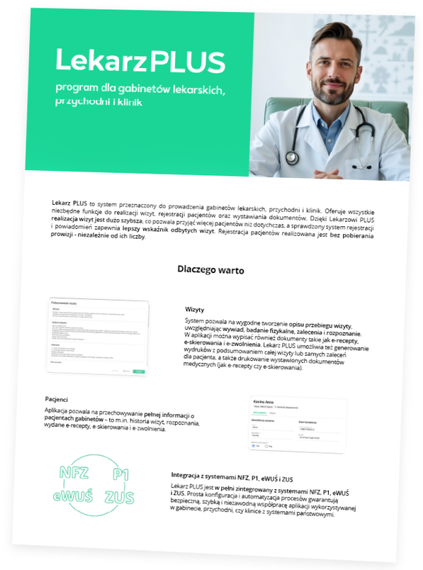 Lekarz PLUS to intuicyjny system w chmurze, zaprojektowany do wszechstronnej obsługi gabinetów lekarskich, przychodni oraz klinik. Aplikacja nie wymaga instalacji na dysku, co gwarantuje błyskawiczny dostęp do danych medycznych z dowolnego urządzenia. Pozwala na sprawne zarządzanie rejestracją, kompleksową realizację wizyt oraz bezproblemową łączność z systemami państwowymi.